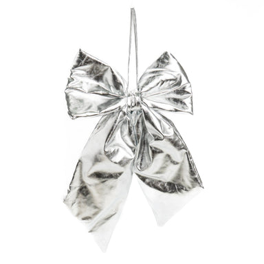 Fiocco in ecopelle metallizzata di colore argento. Dotato di gancio, perfetto come addobbo per albero di Natale, fuori porta, decorazione per feste...