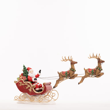Decorazione Babbo Natale su una slitta rossa con dettagli dorati, trainata da due renne con le corna dorate e una sfarzosa sella rossa. Caratterist...