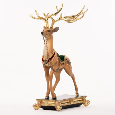 Renna decorativa su base decorata, con grandi corna dorate e sella decorata. Caratteristiche Misure: 32x56CM Colori: Marrone, oro e verde Imball...