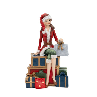 Lady che indossa il classico abito natalizio, seduta su dei pacchi regalo.Caratteristiche Misure 11x18CM Materiale: Poliresina Colori: Rosso e ...