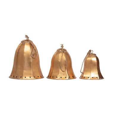 Set da 3 campane in metallo dorato, con gancio in corda per permettere di spostarle con facilità. Caratteistiche Misure: 22/19/16CM Colore: oro ...