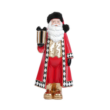 Babbo Natale con un vestito rosso con ricami a scacchi bianchi e nero. Indossa degli stivali dorati e in mano tiene un pacco regalo dorato con stri...