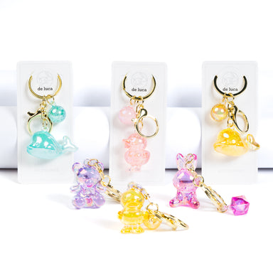 Portachiave in plastica trasparente colorata, in simpatici animali: orsetto, balena, coniglio e papera. Venduto in confezioni da 12 pezzi in colori...