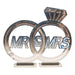 Insegna luminosa decorativa con la scritta MR & MRS in lettere dorate illuminate. La scritta è incastonata all'interno di due anelli intrecciati, che rappresentano le fedi nuziali. Uno degli anelli ha un grande diamante stilizzato sulla parte superiore, simboleggiando un anello di fidanzamento.L'insegna è realizzata con luci LED bianca, creando un effetto luminoso accattivante.