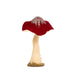 Fungo decorativo di colore bordeaux. Il gambo del fungo è di colore beige e ha una texture morbida Il cappello del fungo è rivestito in velluto bordeaux con bordi ondulati. La superficie del cappello è impreziosita con dettagli scintillanti. La base su cui poggia il fungo è decorata con muschio finto.