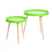 Set 2 tavolini in legno con base d'appoggio bordata, colore verde e fantasia a rombi. Compreso di 3 piedi d'appoggio svitabili in legno.