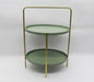 Tavolino colore petrolio, con due piani d'appoggio, con piedi e manico dorati per permettere un comodo trasporto.
