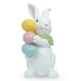 Coniglio in resina con 3 ovetti colorati tra mano, 21x26x43cm. Venduto in cartone da 2 pezzi. Ideale per allestire vetrine, pasticcerie, negozi ed eventi a tema. Simpatica idea regalo per confezioni dolciarie