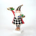 Babbo Natale con una giacca rossa sopra ad un vestito a scacchi bianco e nero. Indossa degli stivaletti dorati e ha due vassoi dorati tra le mani. In piedi su una base quadrata bianca. Ideale anche per eventi o pasticcerie sfruttando i vassoi per finger food e dolcetti.
