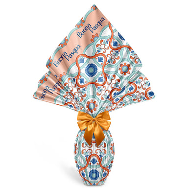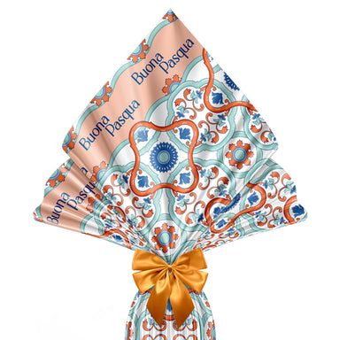 Incarto per uova di pasqua 140x140cm con fantasia vietrese di colore arancione e scritta Buona Pasqua in fascia. Venduto in cartone da 7kg. Abbina...