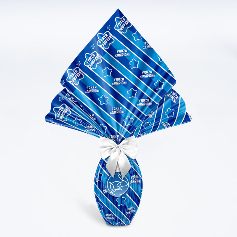 Incarto per uova di pasqua 100x100cm con fantasia stella da calcio e fascia con scritta Forza Campioni in colore blu e azzurro, venduto in cartone da 10kg in colore singolo. Ideale per creare la tua linea sportiva. Abbinalo con il nostro fiocco doppio raso da 14cm. Disegnato dal nostro studio grafico è soggetto a copyright