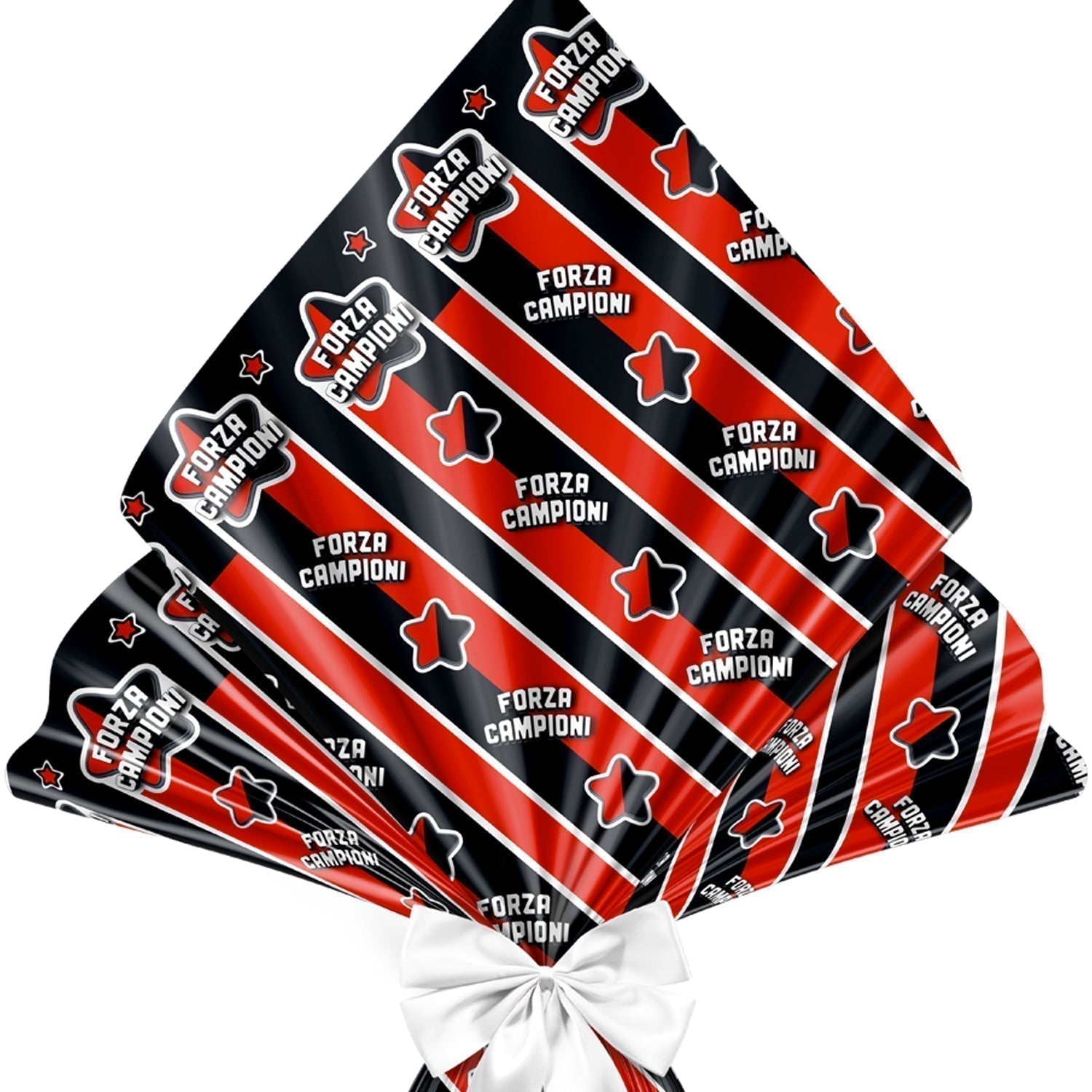 Incarto per uova di pasqua 100x100cm con fantasia stella da calcio e fascia con scritta Forza Campioni in colore rosso e nero, venduto in cartone da 10kg in colore singolo. Ideale per creare la tua linea sportiva. Abbinalo con il nostro fiocco doppio raso da 14cm. Disegnato dal nostro studio grafico è soggetto a copyright